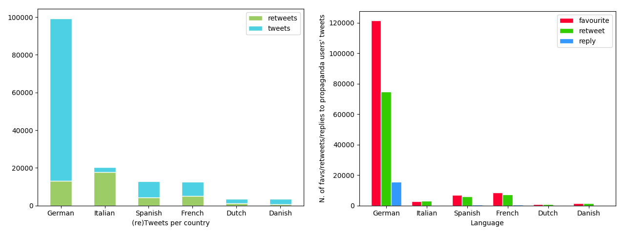 The first step is to compare the volume of tweets written in these six languages and the interactions generated by these tweets. On the left the amount of tweets and retweets written in German, Italian, Spanish, French, Dutch and Danish. There are many tweets and retweets in German and Italian, few in Spanish and French. This information is interesting because Spanish is the second most spoken language in the United States, spoken by fourty million people, and the second in the world as well, so I expected many tweets written in Spanish - I was wrong. Another interesting number is the ratio between tweets and retweets (#tweets / #retweets), for all these languages the ratio is greater than 1 except for Italian. On the right there are the volumes of the interactions (favorites, retweets and replies), divided by language. The volume of the interactions to the propaganda tweets written in German is much larger than the others: to make a comparison, the second largest volume (interactions with French tweets) is almost 13 times smaller. The Italian case is interesting again, there are 20.376 tweets (tweets + retweets) in Italian, +61% than French tweets, but the total interactions with the propaganda tweets in Italian are only 6.197, less than half of the total interactions to the tweets written in French. Looking at these two plots, my own conclusion is that in Germany there could have been Internet Research Agency propaganda and that Italy seems to be a “special”² case.