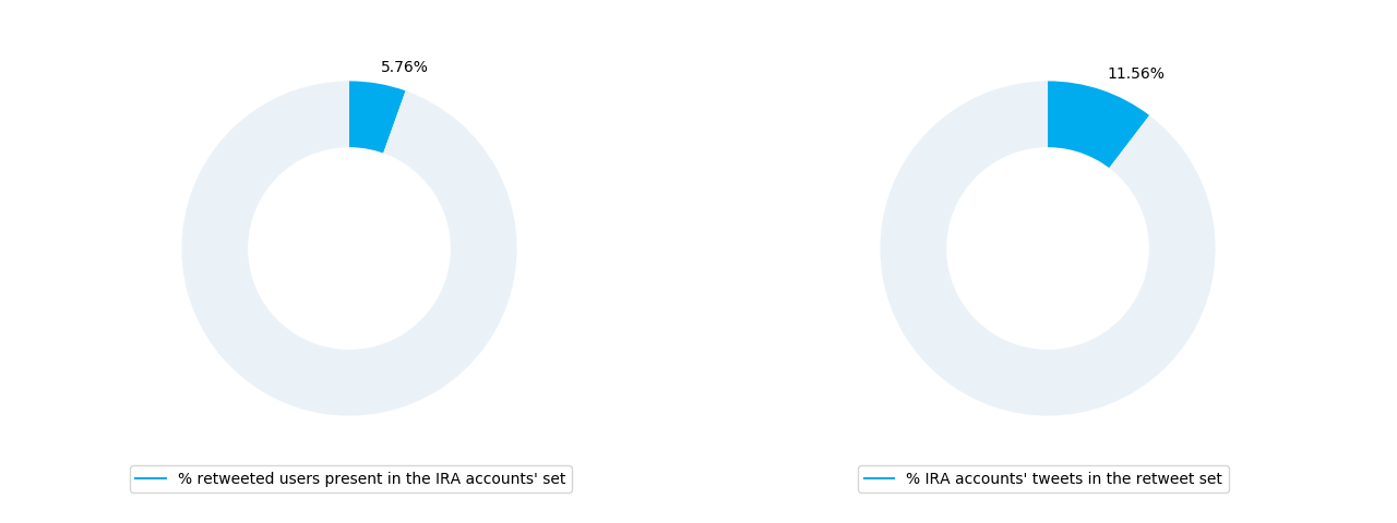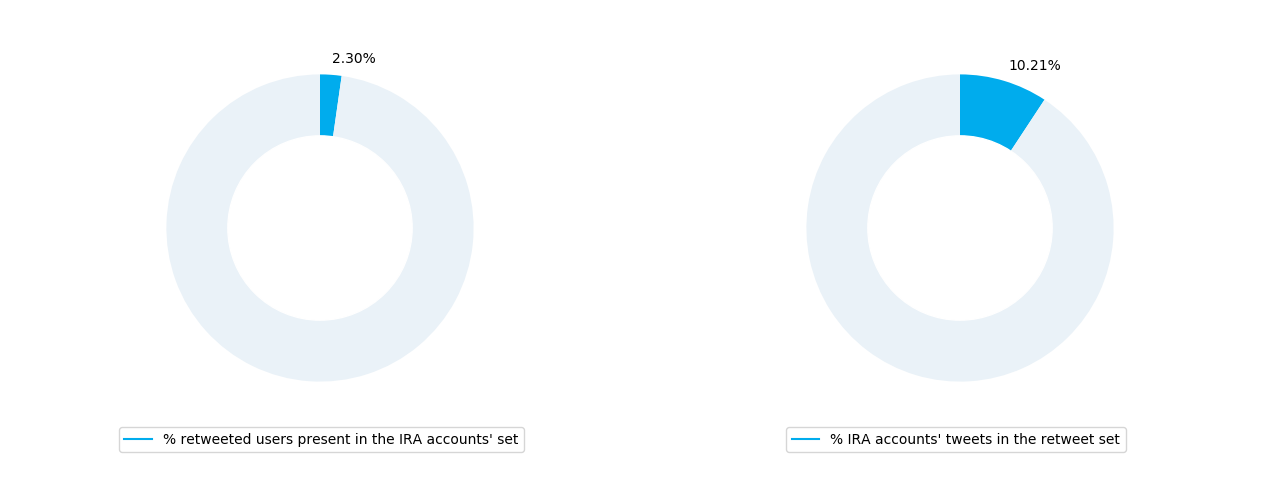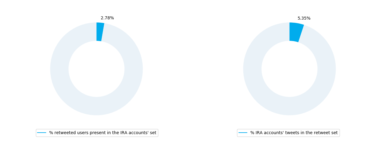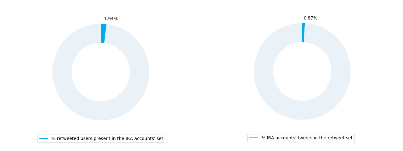 On the left, the percentage of IRA accounts that are the authors of the tweets retweeted by other IRA accounts. On the right, the percentage of tweets written by IRA accounts among the retweeted tweets.