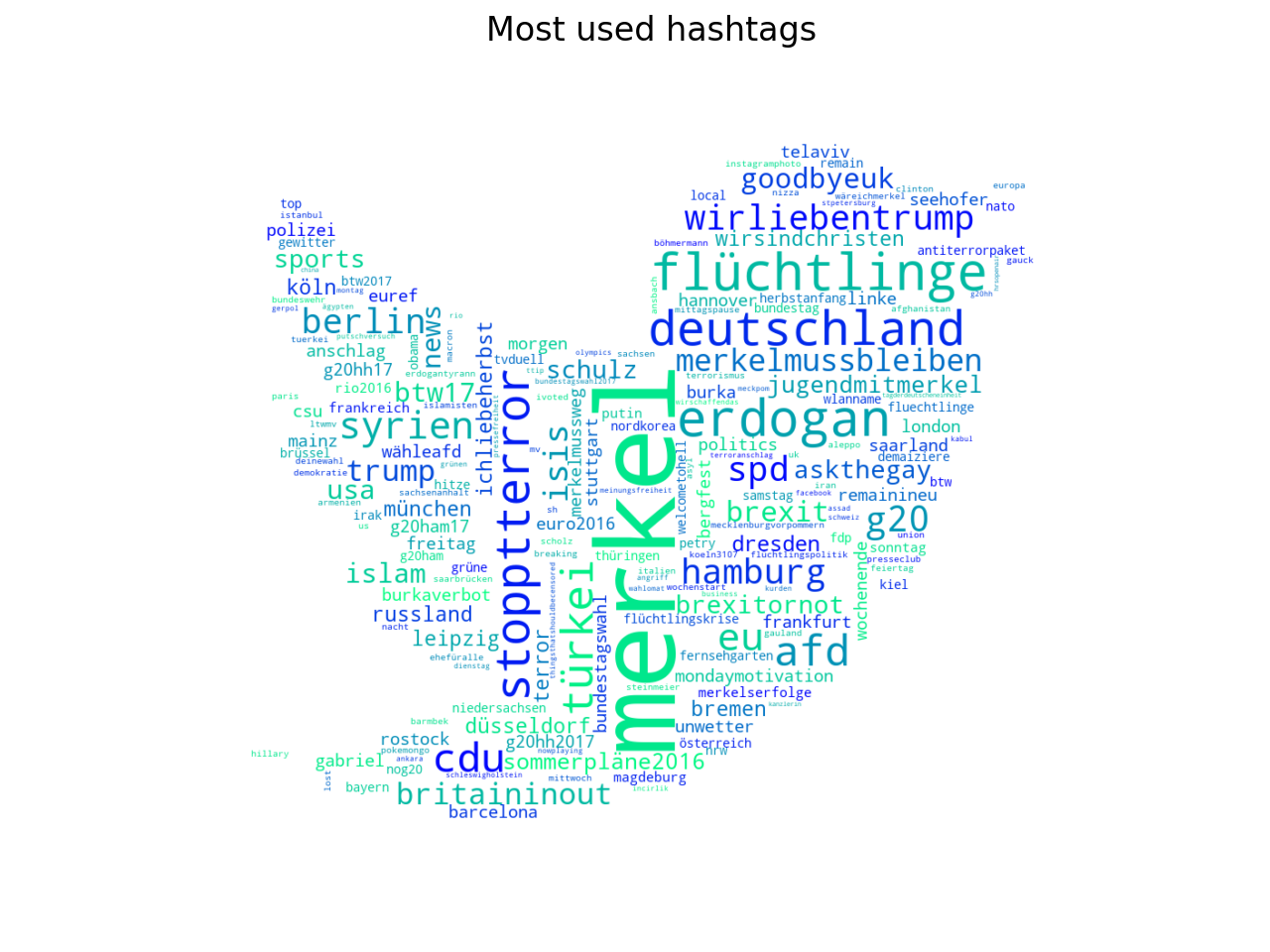 The twenty-one (21) most retweeted accounts are the authors of 25% of all retweeted tweets and they are 0,7% of all retweeted accounts. Among these there are many mainstream media and journalists (e.g. @welf, verified account of the newspaper “Die Welt”, @SPIEGELONLINE, verified account of the newspaper “Der Spiegel”, and @tagesschau, verified account of the television news provider “Tagesschau”), and three propaganda accounts (@erdollum and others two which are hashed because they have less than 5.000 followers). The user @erdollum was created in 2016 and had 7.691 followers, the others two were created in 2016 and 2015 and they had 4.654 and 938 followers each. If I increase the previous percentage up to 50%, I find that 135 users (4,4%) are the source of half of all retweeted tweets, of which 18 ones are IRA accounts. To get a full picture of the topics, I have also create a word cloud with the most common hashtags (by “common” I mean “used in at least ten tweets or retweets”).