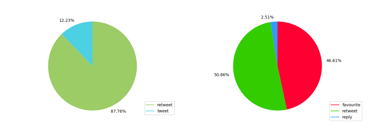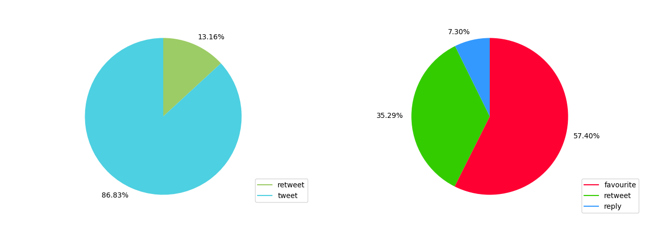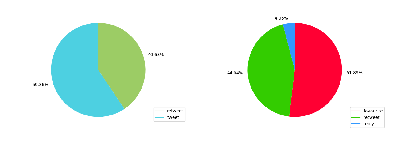 On the left, the pie plot of tweets and retweets in German. On the right, the pie plot of the interactions with these tweets.