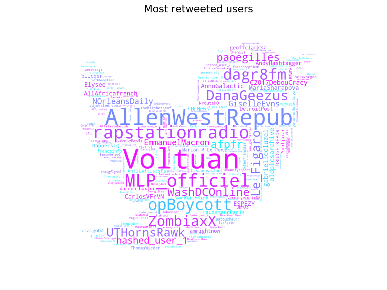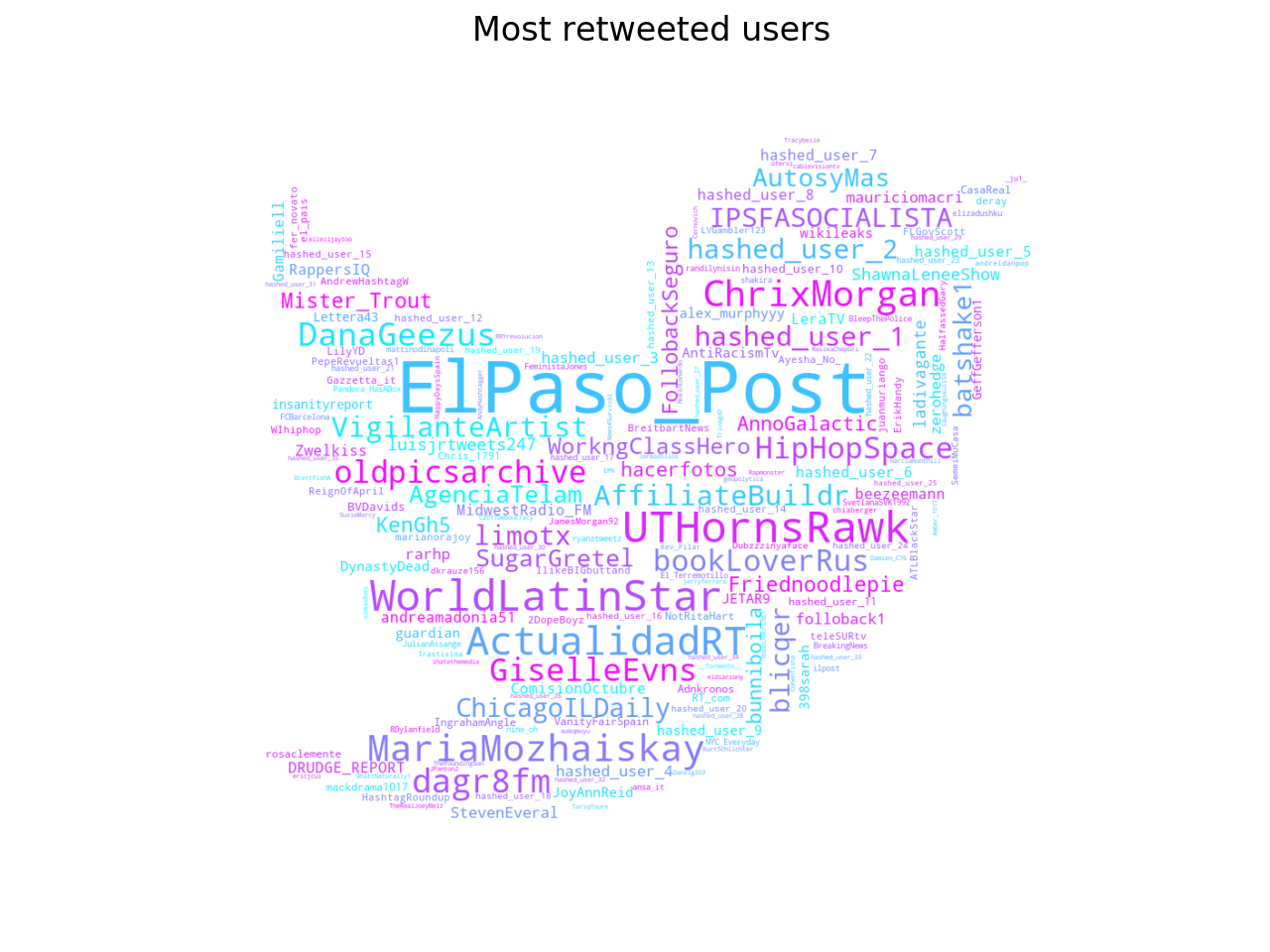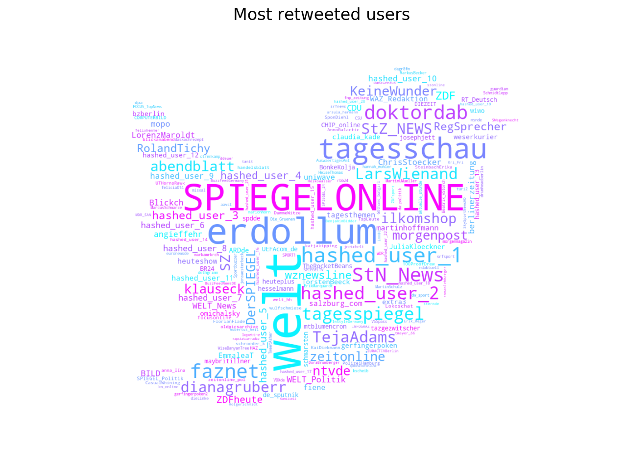 I was surprised to see that Russian users have retweeted a small group of Russian users (only 70 propaganda accounts out of 3.036 retweeted users), but the tweets written by this small group are 10% of all retweets in German. I have created a word cloud with the most retweeted users (retweeted at least five times) to get a better view. For convenience I have replaced the Russian hashed users with the value “hashed_user_n”, where n is an index to count these users.
