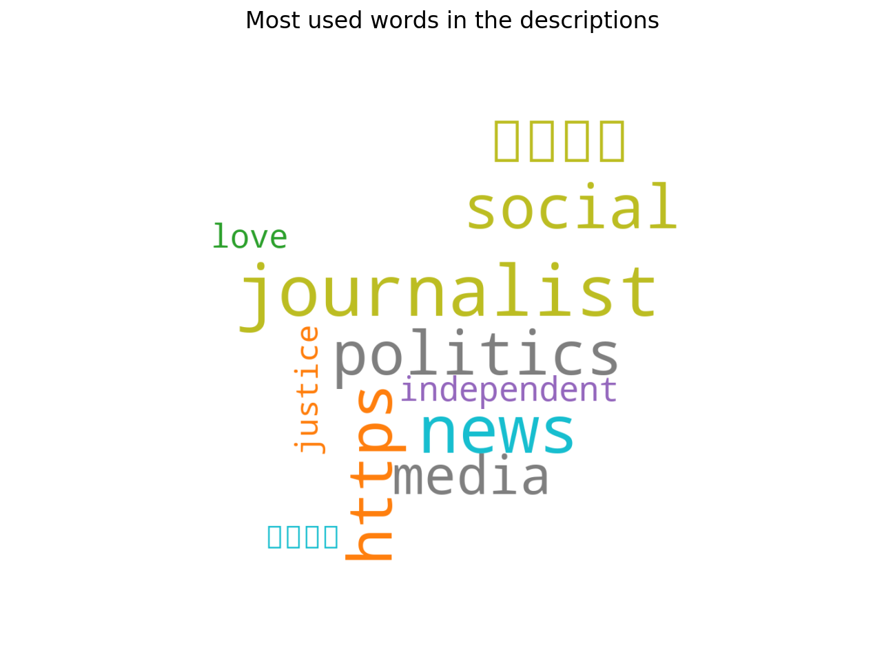 By comparing the languages of the tweets and the languages of the descriptions, obtained with langid, I have found results more congruent among them. The set of the five most used languages in the tweets and the set of the most used languages in the descriptions had four elements in common: French (fr), English (en), Arabic (ar) and Persian (fa). The results obtained with langid could be inaccurate, but they are consistent with the data about the tweets’ languages. It is also interesting to see the most frequent words in the descriptions.