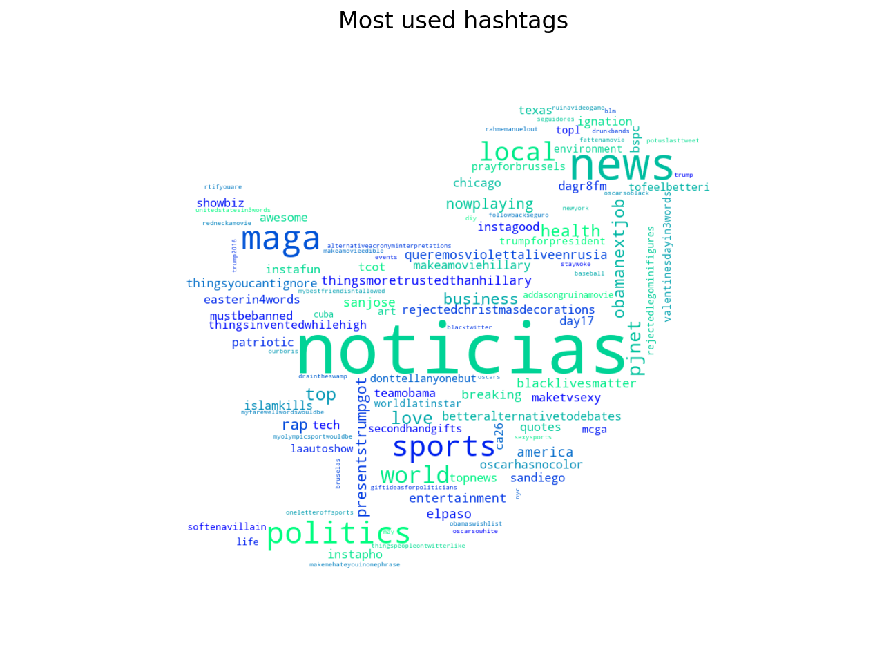 I have counted 1.918 different hashtags in the Spanish tweets, used 8.772 times. There are many generic hashtags, like #Noticias (the most frequent hashtag, used 1.969 times, in English it means “news”), #News (539 times), #Politics (217), #Sports (206), #Local (154), #World (121), #Rap (46) or #NowPlaying (44). The hashtags about the American elections are interesting, they seem to be directed to a specific target “close to” these elections (in my own opinion). There are hashtags about Obama (#ObamaNextJob, used 58 times, #TeamObama, used 22 times, #ObamasWishlist, used 10 times), Hillary Clinton (#ThingsMoreTrustedThanHillary, used 32 times, and #MakeAMovieHillary, used 22 times) and, obviously, Trump (#MAGA, used 268 times, #PresentsTrumpGot, used 47 times, #TCOT, used 30 times, #TrumpForPresident, used 15 times, and #Trump2016, used 10 times). There are at least seven hashtags about the black people and the problem of racism (e.g. #BlackLivesMatter is repeated 33 times), I suppose these trends were useful to polarise people (especially conservatives against a minority).