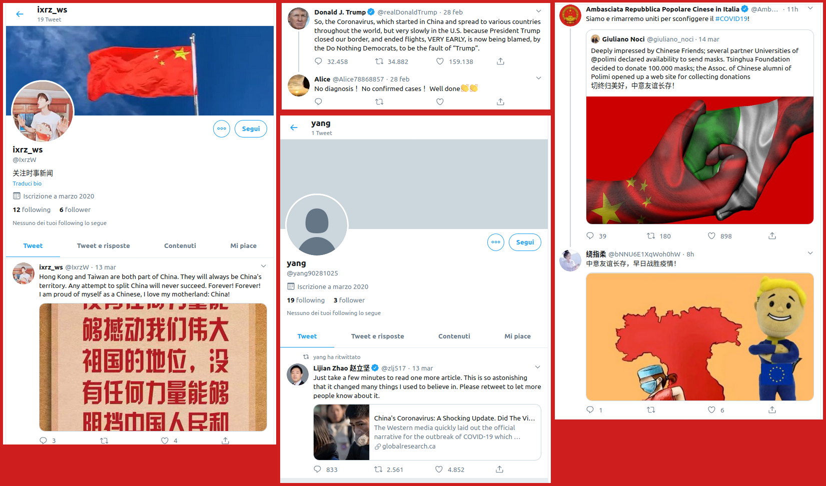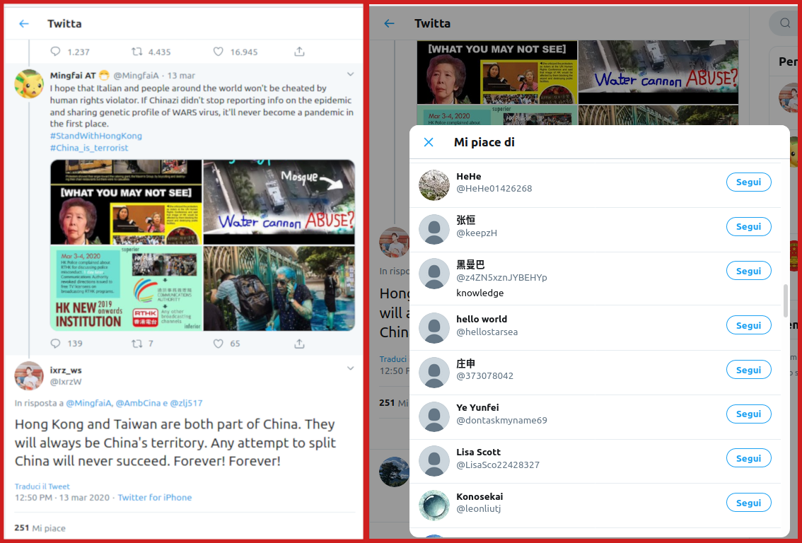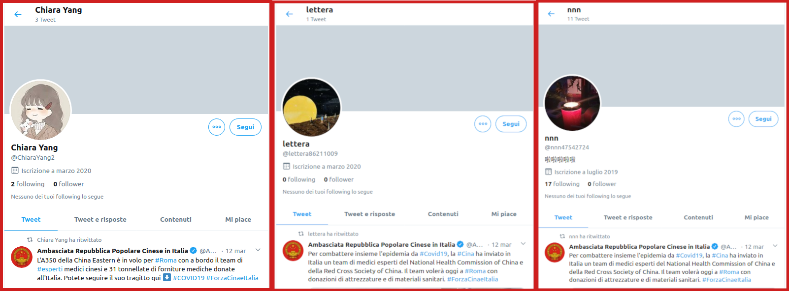 Italy is facing dark days because of coronavirus and there is a lot of disinformation about this topic, especially on messaging apps and social networks (the journalist Jane Lytvynenko is collecting and debunking a large number of fake news about COVID-19). Last week (03/12) China sent a team of doctors and equipment for Italian hospitals, a part of which Italy will pay for. The Chinese Embassy in Italy reported the news on Twitter and – during these particular days – their Twitter account is particular active. Their tweets have generated many retweets, likes and positive replies – many thanks from Italian people – because coronavirus is a world issue and people are scared. This is the bright side of it, but there is another side: many tweets and reactions seem to have been created by bots or suspicious accounts, usually with few tweets, no profile pic, absolutely pro Chinese government and anti USA. If you try to reply in a negative way to the Chinese Embassy in Italy (@AmbCina), you will probably receive this message from some users: nmsl, Chinese slang that stands for “Your mom is dead”.
