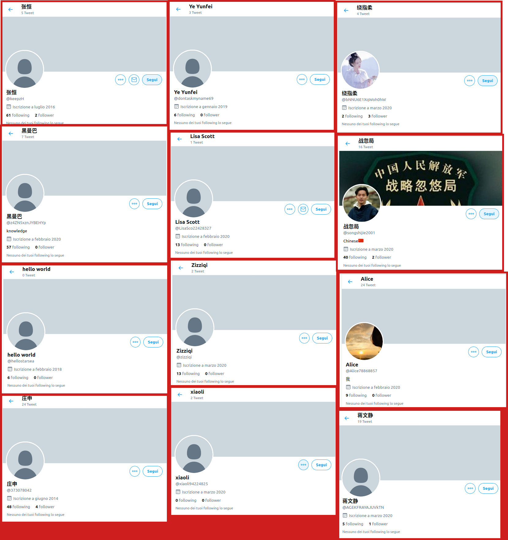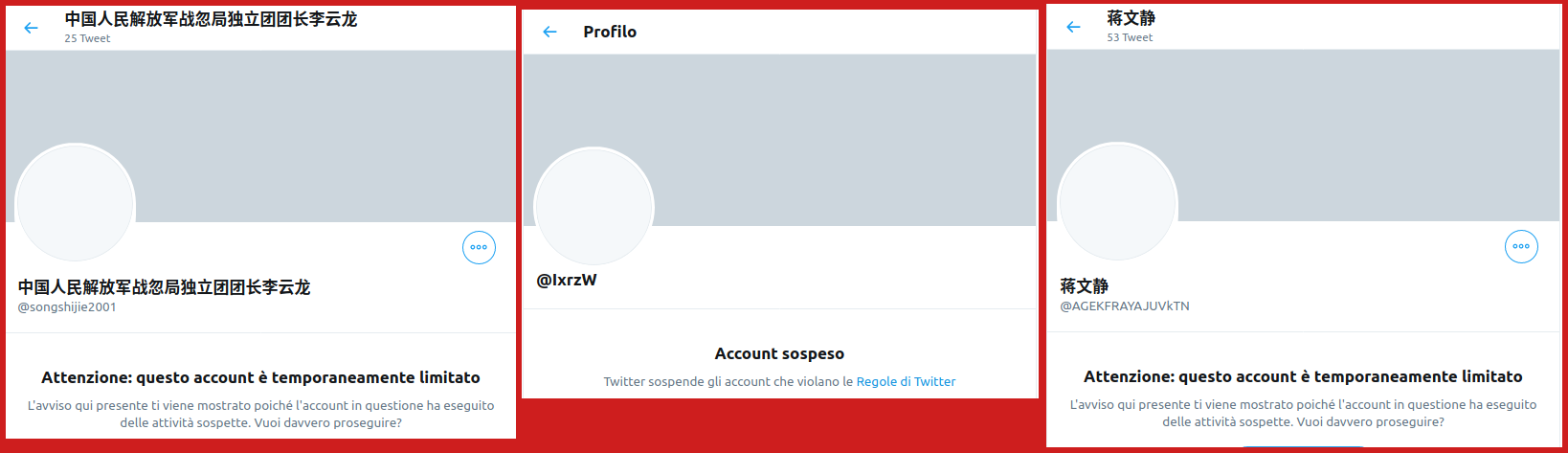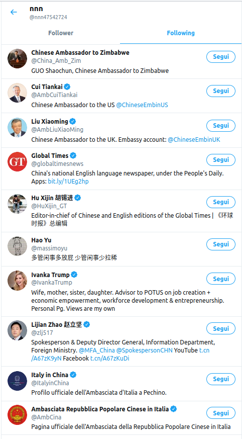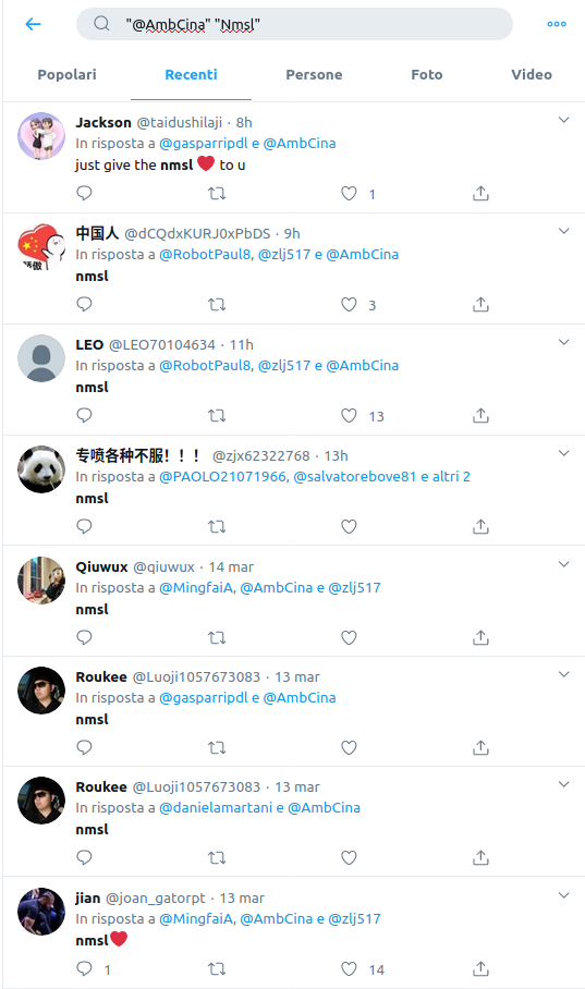 However, by searching “nmsl” you can find many similar accounts that reply to China opponents, especially if the negative tweets are replies to government accounts (e.g. see @AmbCina or @zlj517, Chinese Foreign Ministry), so it seems to be a worldwide trend. I don’t and cannot know whether the Chinese government is trying to manipulate public opinion on Twitter and to create a positive story-telling about government’s choices, but all these accounts seem to behave in a coordinate way. Only Twitter can really investigate on them, and I hope they are doing it.