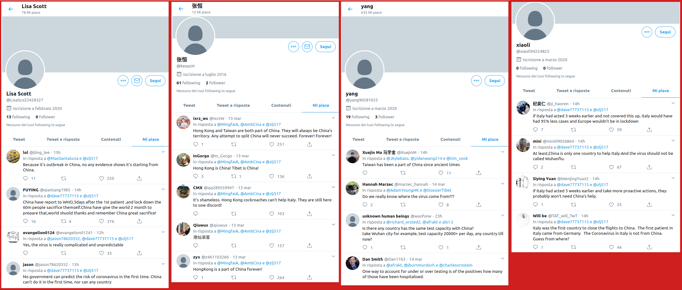 Usually they don’t write tweets and don’t retweet, someone give some replies, usually replies are insults against China opponents’ tweets or against the USA, but their main activity is **to boost **pro-China tweets by liking them. This especially happens with tweets that are about One-China policy (against Hong Kong protests) or give a different story-telling about coronavirus where China has no faults, or, in general, if they give a positive outlook on Chinese government.